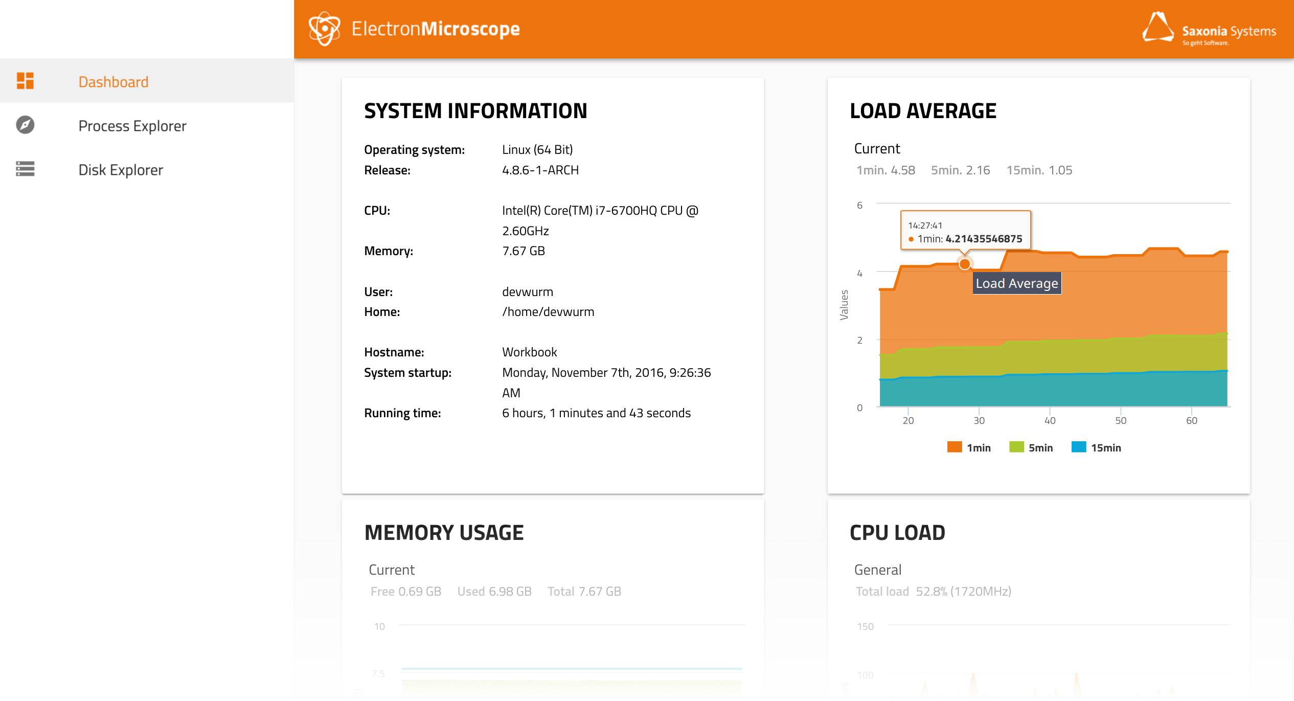 Electron-Microscope is a full featured system monitor and explorer for monitoring your devices status and exploring its usage.